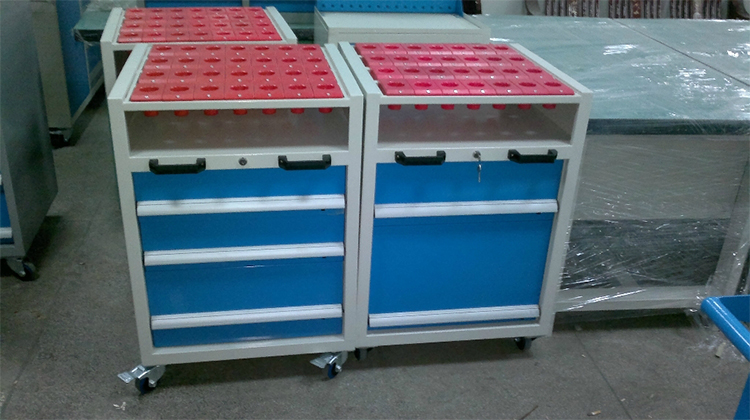 刀具車俗稱放刀具的車子,是專門用于存放、搬運刀具的常用裝備。因為刀具車上配有根據不同規格刀具的刀套,可以快速地放置和存取刀具,加上腳輪,可以根據車間使用部門需要自由才車間使用,方便快捷!所以很多客戶用了后非常喜歡。